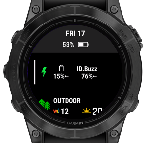 | If sufficient memory is available, the glance will show battery and vehicle SoC along with charging/discharging status, updating at the configured interval. | On devices with limited memory, the glance displays only battery and vehicle SoC. Due to memory constraints, it cannot process the state from evcc directly. Instead, a background task retrieves the state, which Garmin restricts to every five minutes. As a result, real-time charging/discharging information is not shown, and the glance indicates the data's age in minutes. |