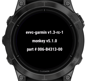 The view shows the evcc-garmin version, the Connect IQ (monkey) version supported by the device, and the device’s part number.